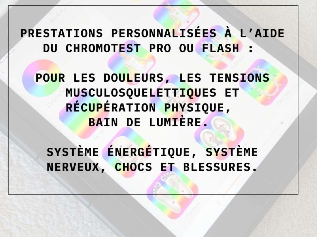 Toutes les séances se terminent par un bain chromatique personnalisé favorisant une profonde détente et une harmonisation générale